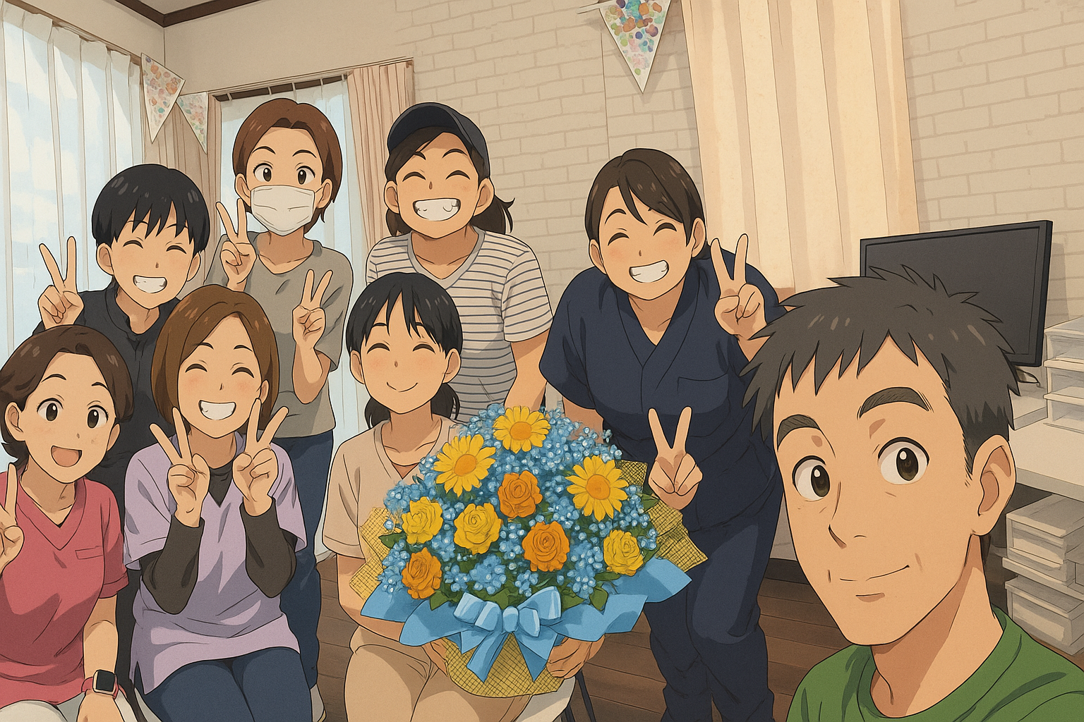 画像は、そのときに撮った写真をチャッピー(巷ではChatGPTをそう言うようですね)にお願いして、アニメ調にしてもらいました。皆さんの特徴をいい感じに捉えていてお気に入りです。